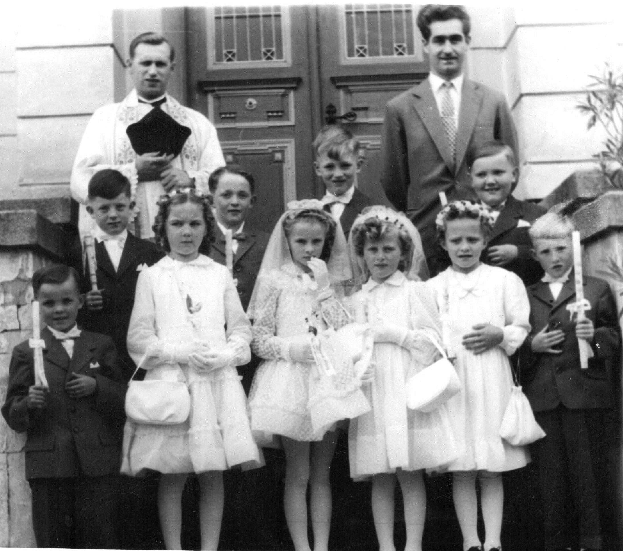 Erstkommunion Pfingstmontag, 30. Mai 1955 Franz Steiner, Leopoldine Selinger, Wilhelm Emathinger, Maria Wagner, Karl Ziegler, Gertraud Kühberger, Rupert Emathinger. Pfarrer Burkhard Bohuslaw und Frau Paula Eiblhuber.