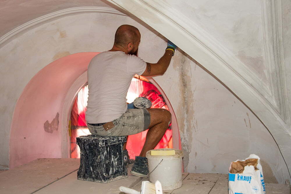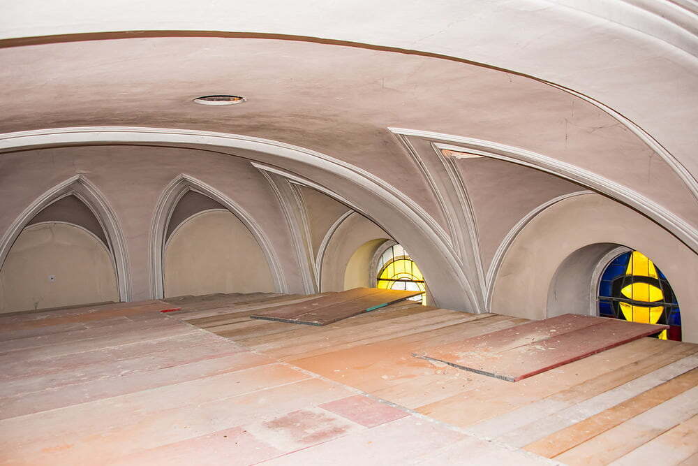 Die Fenster aus Antikglas zeigen die sieben Sakramente...