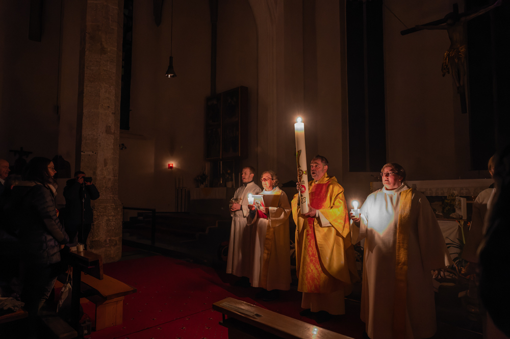 Die verschiedenen Lesungen vergegenwärtigten die Heilsgeschichte Gottes mit uns Menschen. Diese Heilsgeschichte findet in der Auferstehung Christi einen besonderen Höhepunkt. Dies wurde in Gloria, dem Oster-Halleluja und dem Oster-Evangelium spürbar.