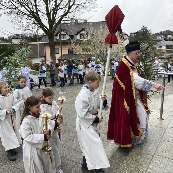 Die Palmweihe fand in diesem Jahr - wegen des unsicheren Wetters - in der Kirche statt. Ministranten und Erstkommunikanten zogen - voran der Pfarrgemeinde - in die Kirche ein.