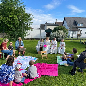 Diesen Versuch starteten wir am Freitag, 10. Mai bei der Kinder- und Familienmaiandacht auf der Pfarrwiese. Zuerst durften die Kinder etwas unter einem Tuch ertasten - es war der schützende Mantel von Maria, dann erzähle uns Sabine davon und die Kinder durften sich unter den Mantel stellen – es hatten alle Platz! Im Anschluss bastelten die Kinder einen Schlüsselanhänger.